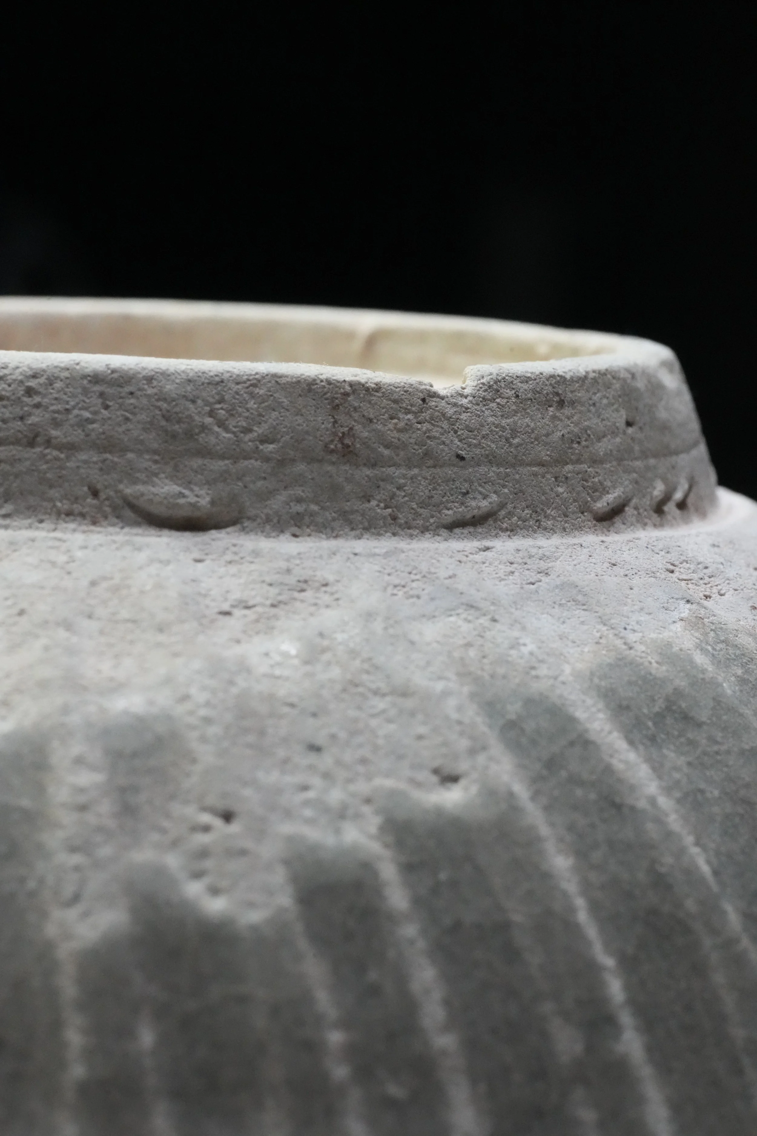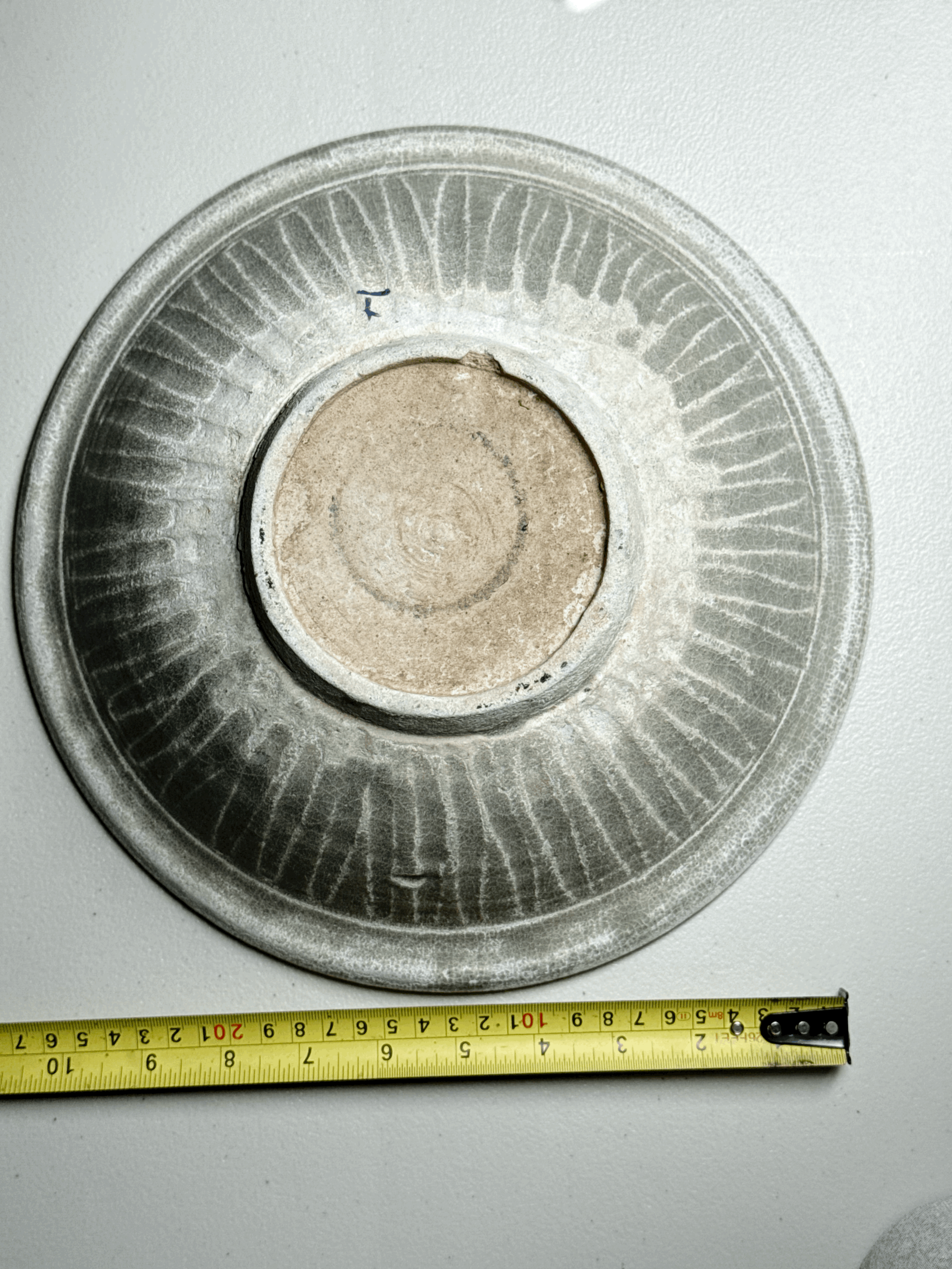 Hiện vật gốm cổ được chế tác bằng kỹ thuật bàn xoay thủ công, phủ men ngọc xanh xám mỏng, có craquelure (vết rạn men tự nhiên) lan tỏa đều. Họa tiết trang trí gồm vân móc kép khắc chìm bên trong lòng và các đường khắc vân dọc thân ngoài, tạo hiệu ứng “vân lông công” thanh nhã. Đáy để mộc, có vòng xoáy bàn xoay và dấu chân kê nung cháy men – cho thấy quy trình nung cổ truyền ở nhiệt độ cao. Kích thước chuẩn cho đồ tế phẩm hoặc phẩm cấp cao.
